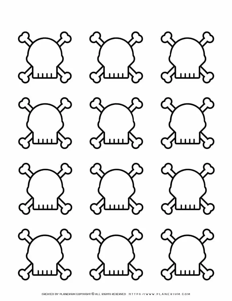 Customizable template with 12 skulls for coloring, arts & crafts.