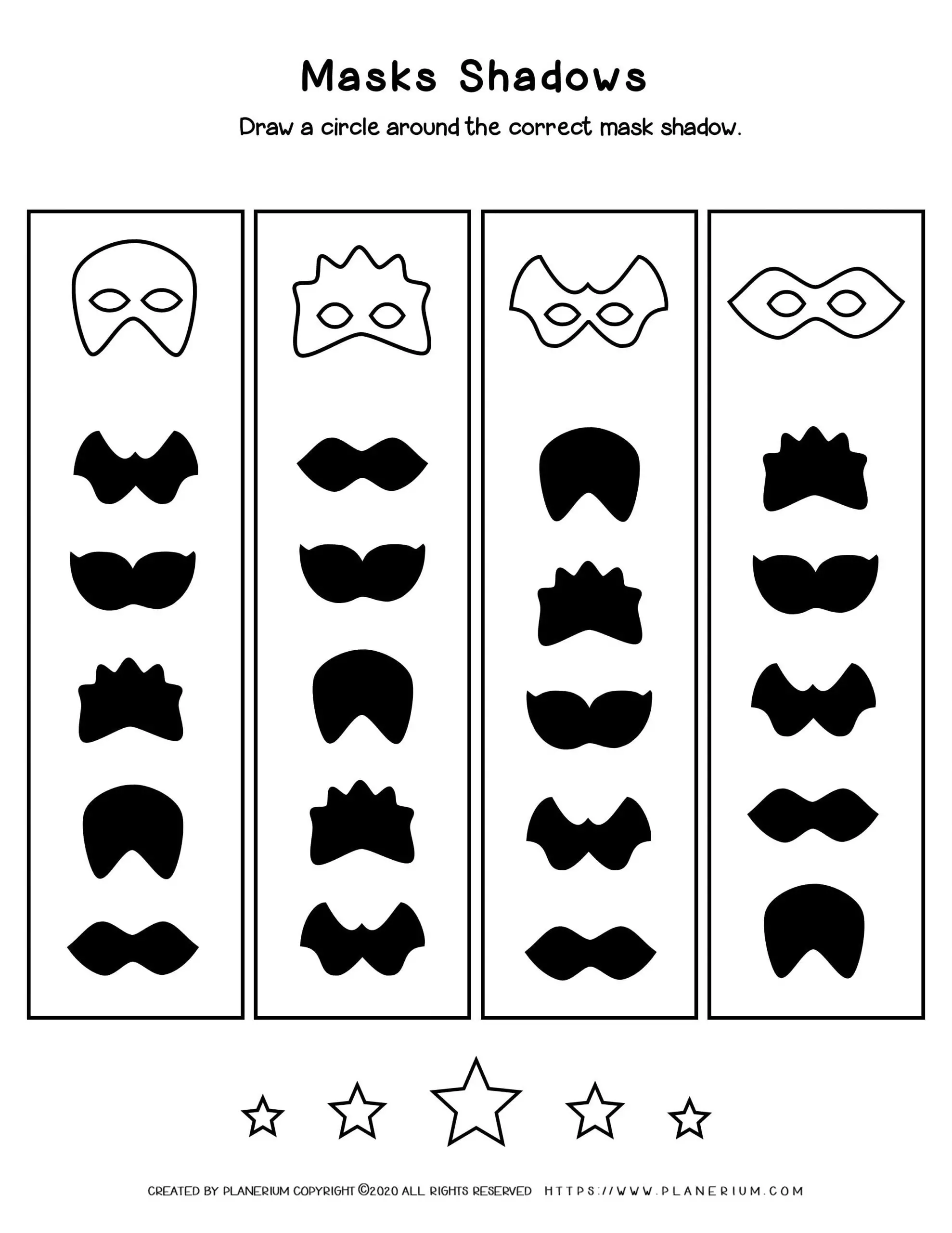 - Use as a brief warm-up: give students the Carnival Masks shadow matching printable and have them draw a line between each image and shadow pair to settle attention and check visual skills.